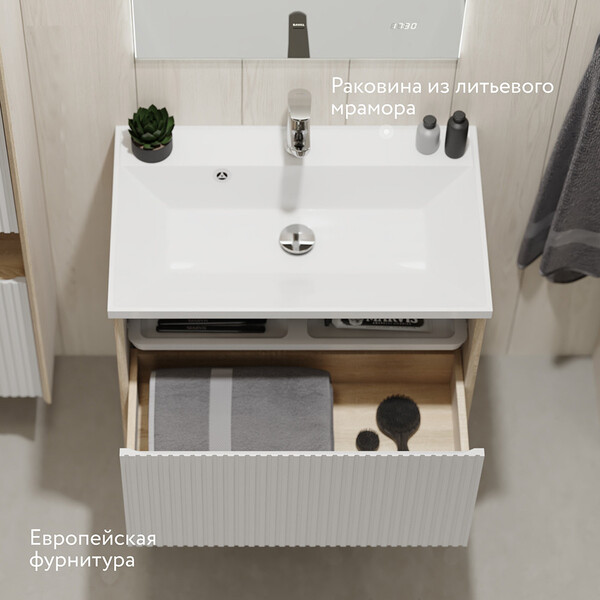 Тумба с раковиной из коллекции Tossony бренда Jorno – это гармония стиля и функциональности. Фасады выполнены из высокопрочного влагостойкого МДФ. Ребристая поверхность с покрытием Soft touch устойчива к царапинам. Раковина выполнена из литьевого мрамора. Тумба оснащена выдвижным ящиком-органайзером для хранения мелочей.