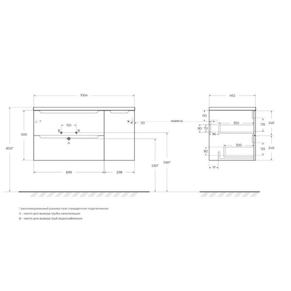 Тумба под раковину подвесная левосторонняя. Тумба оснащена доводчиками, ручки скрыты в плоскости фасада.