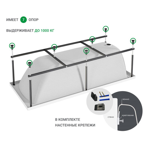Разборная рама для прямоугольной ванны – надежное и устойчивое решение для установки ванны. Благодаря дополнительной обработке металлической конструкции практически исключается коррозионное воздействие, а регулируемые ножки позволяют установить ванну даже на неровной поверхности. Максимальная нагрузка 600 кг.