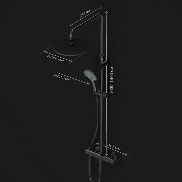 Душевая система имеет продуманные детали для комфортного использования – штанга регулируется по высоте в диапазоне от 1030 до 1460 мм, обеспечивая комфорт для людей любого роста. Шаровый шарнир в держателе верхнего душа позволяет регулировать угол его наклона, душевой шланг длиной 1750 мм, верхний душ диаметром 254 мм, ручной душ диаметром 120 мм удобны в эксплуатации. Интенсивный напор даже при низком давлении в системе. Термостатический картридж с высокочувствительным термоэлементом, стопором безопасности на 38 градусов, быстрой реакцией на изменения температуры или давления надежно защищает от ожога, даже при внезапном отключении холодной воды.
