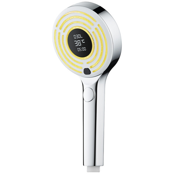 Лейка светодиодная 3-х позиционная Digit. Типы потока струи – душ, шелковый дождь, душ/шелковый дождь. Цифровой дисплей показывает температуру потока (°С), время использования (сколько минут/секунд). Цветовая подсветка форсунок меняется в зависимости от расхода воды: зеленый <25 л, желтый от 25 до 50 л, красный >50 л. Под дисплеем кнопка обнуления данных (во время эксплуатации). Работает без батареек. Источник питания – встроенная минитурбина.