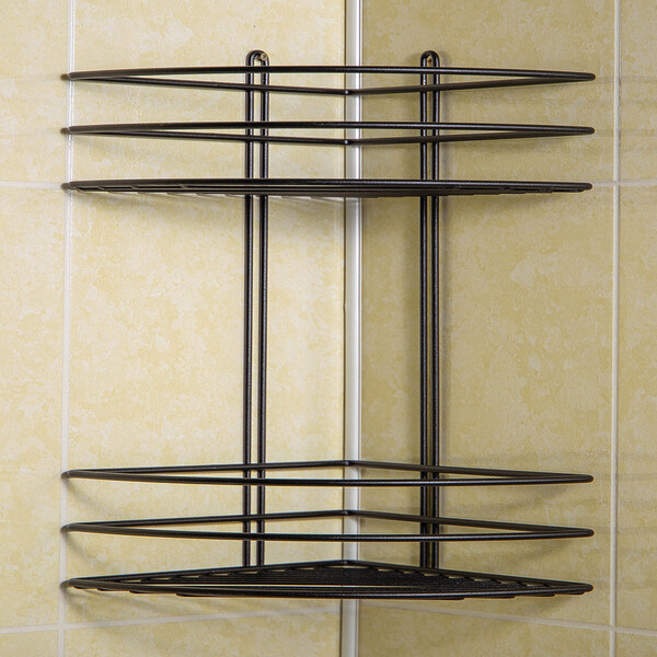Полка угловая двухъярусная высокая, изготовлена из высококачественного металла с черным матовым покрытием.