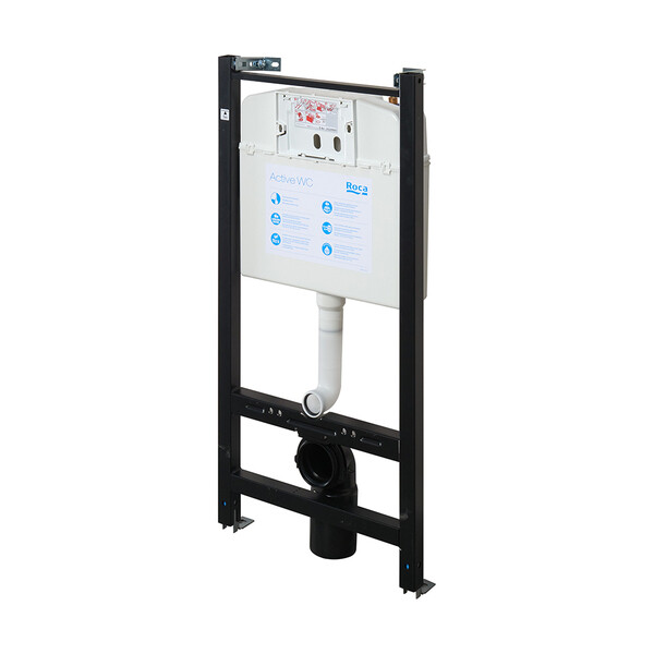 Инсталляционная система Roca Active для унитазов с межосевым расстоянием 180 и 230 мм. Надежная рама из стального профиля 40х40 мм покрыта порошковым антикоррозийным покрытием. Ножки регулируются по высоте. Бачок защищен от шума и конденсата. Подвод воды сверху посередине/справа. Объем смыва по умолчанию настроен на 6/3 л.